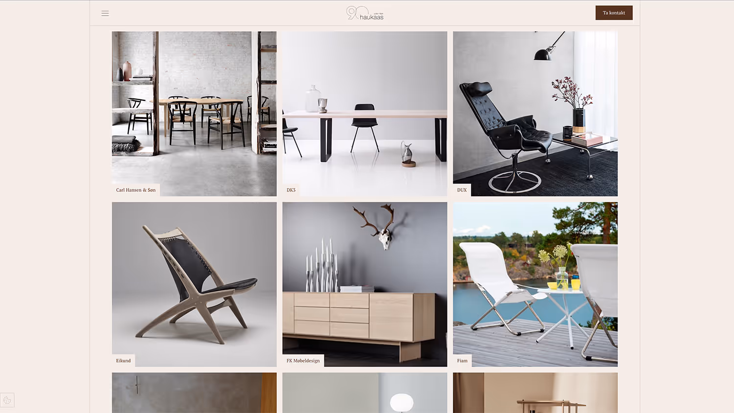 Det visuelle uttrykket er bygget rundt en rolig eiketone – et bevisst valg som refererer til både skandinavisk designtradisjon og materialbruk. For å balansere klassiske og moderne elementer ble det benyttet en kombinasjon av groteske og antikvaskrifter, strukturert i et stramt grid. Tynne, diskrete linjer rammer inn innholdet, samtidig som generøs bruk av luft gir nettsiden et lett og harmonisk uttrykk i tråd med skandinavisk estetikk.