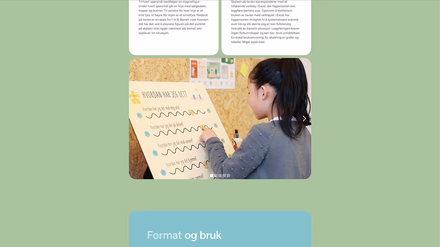 Det visuelle uttrykket bygger videre på Sammenkartets eksisterende identitet, med runde former og lette, friske farger som skaper et oversiktlig og behagelig inntrykk. For å tilføre dynamikk og visuell variasjon er det lagt inn myke fargeoverganger gjennom brukerreisen, som bidrar til å gjøre nettsiden mer engasjerende uten å gå på bekostning av tydelighet og ro.