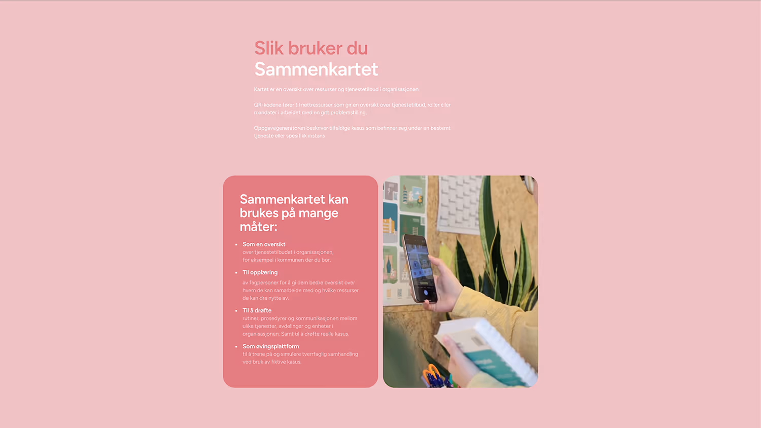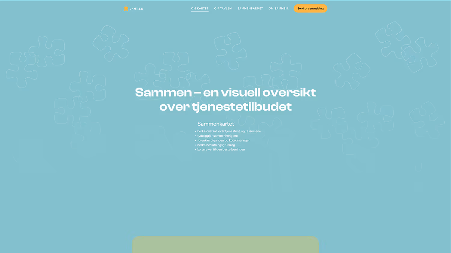 Etter økende etterspørsel etter Sammenkartet oppstod behovet for en egen nettside som kunne forklare og formidle løsningen til nye brukere og interessenter. I 2024 utviklet jeg denne nettsiden, med mål om å gi en tydelig og lett tilgjengelig introduksjon til Sammenkartet – og etter hvert også øvrige produkter i «Sammen»-universet.