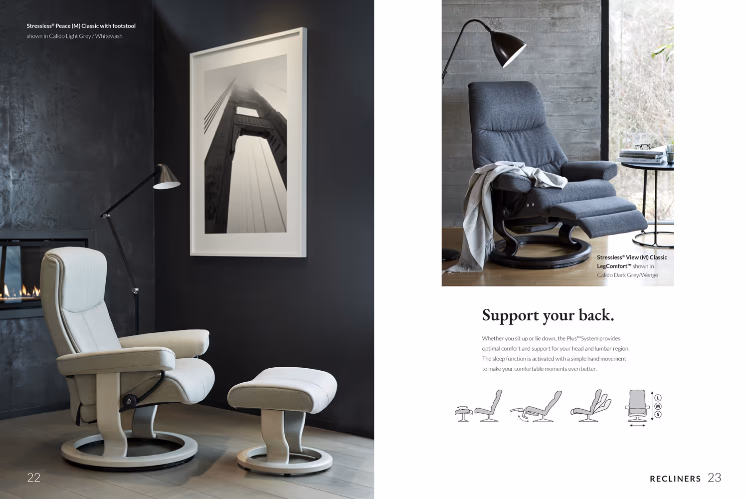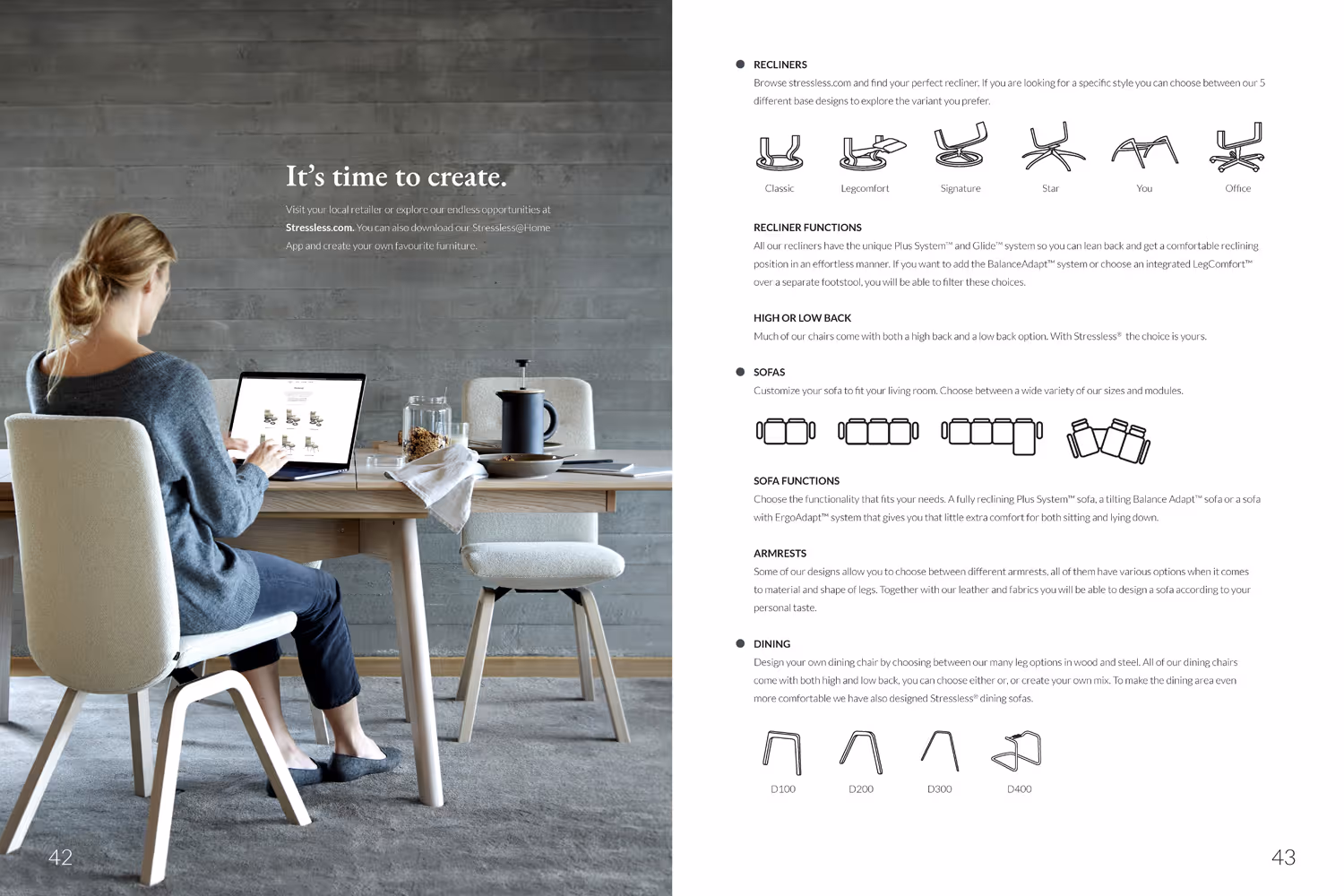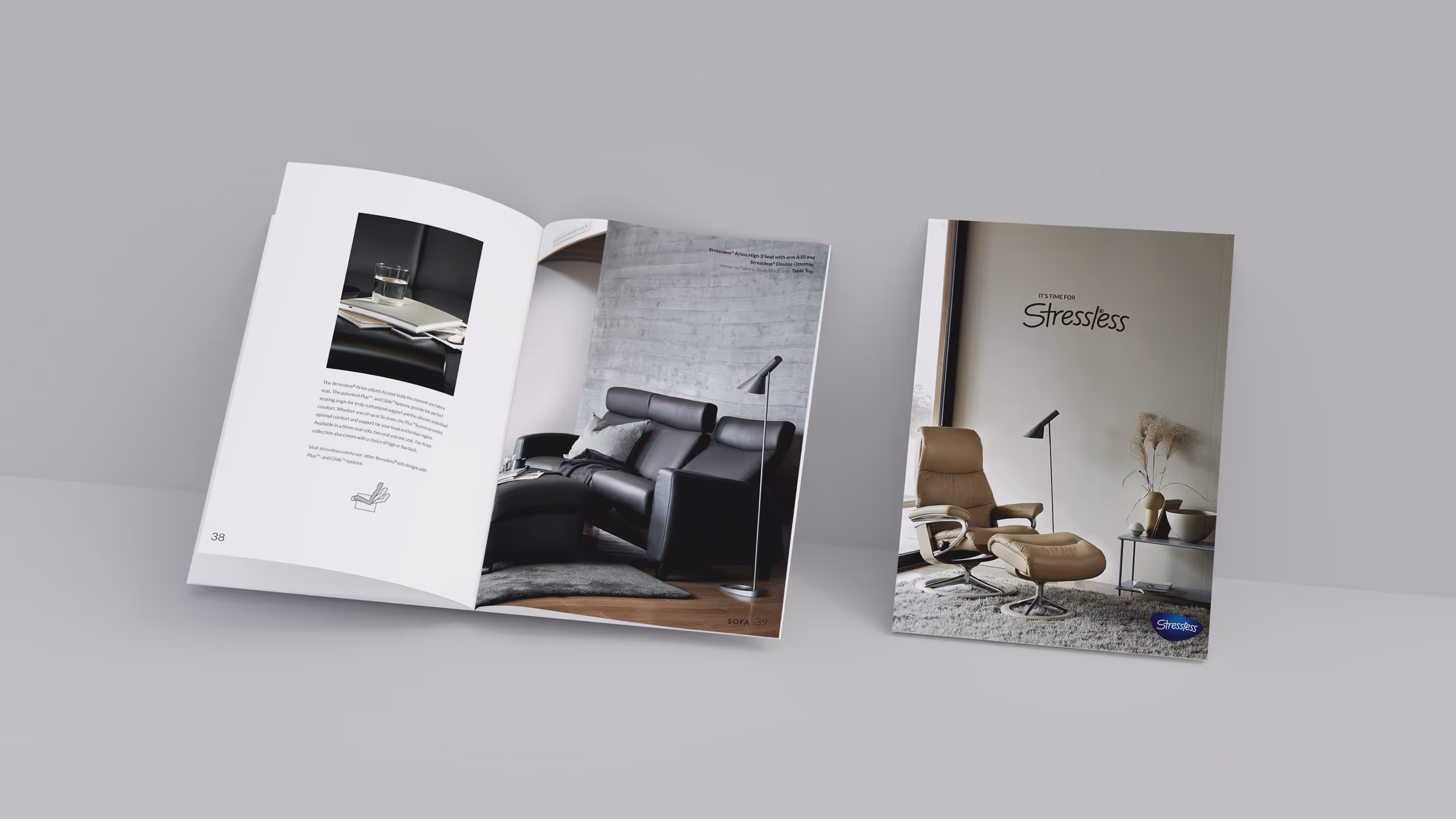 I 2019 designet jeg Stressless’ årlige produktkatalog og utviklet nye ikonillustrasjoner. Kunden ønsket et tidløst uttrykk som formidler eksklusivitet og høy kvalitet. Med sterke produkter og flotte bilder som utgangspunkt var det viktig å la det snakke for seg selv. Layouten er derfor preget av romslige oppslag og en rolig typografisk struktur, slik at leseren får en behagelig og intuitiv opplevelse – i tråd med følelsen av å bruke et Stressless-møbel.