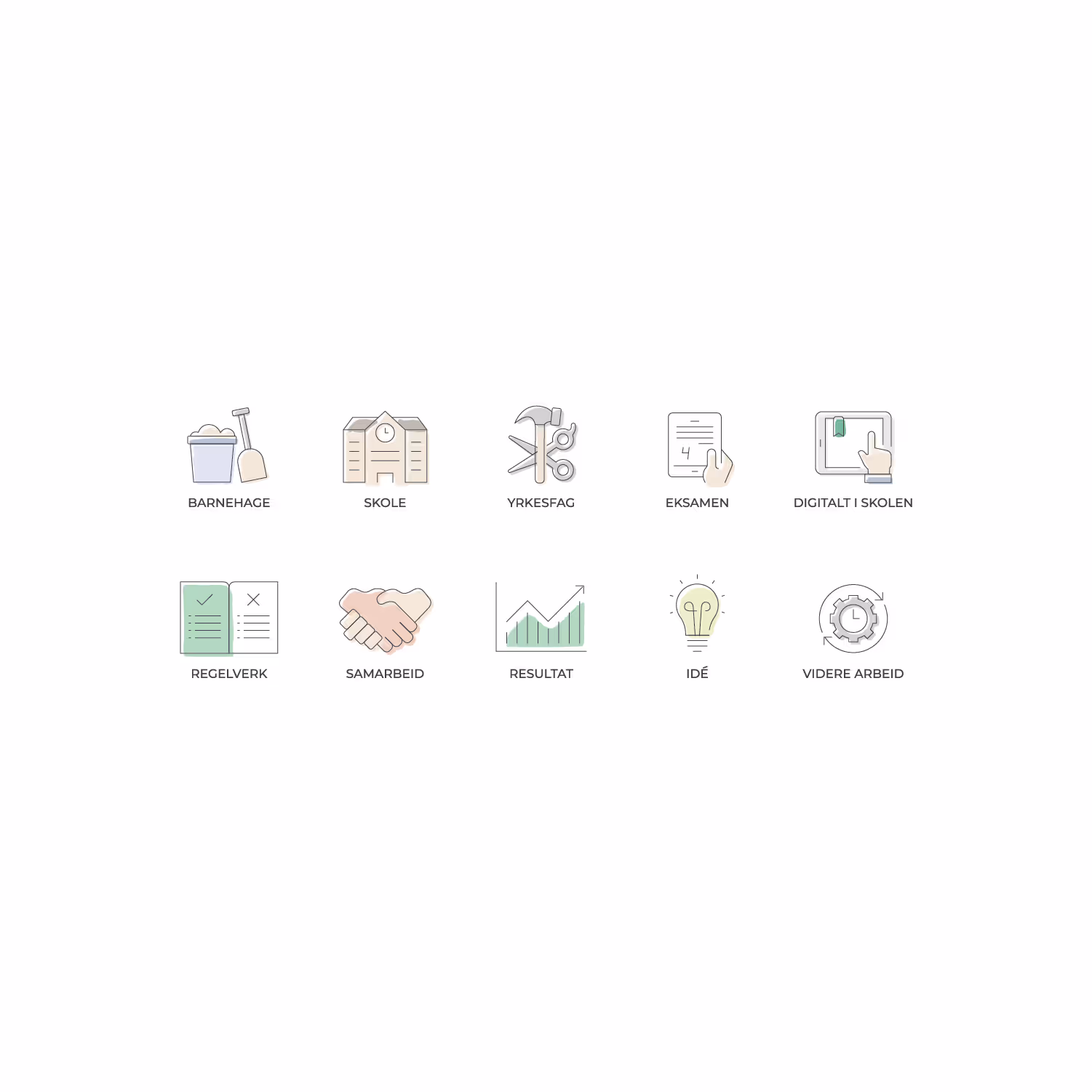 Alle elementer i profilen ble grundig gjennomgått og videreutviklet. Prosjektet var omfattende, og jeg leverte blant annet ny logo, fargepalett, formspråk, illustrasjoner, malverk for læreplaner, kontorfolie og mye mer.